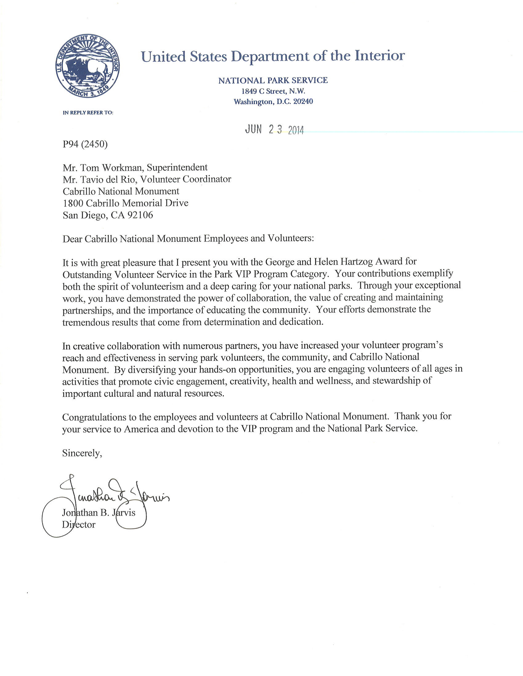 Park AdminHartzog Award Letter Here is the letter from Jonathan B. Jarvis, Director of the National Park Service, that accompanied the Hartzog Award (click on the image to make it larger): Share this: Click to share on Facebook (Opens in new window) Facebook Click to share on X (Opens in new window) X Click to email a link to a friend (Opens in new window) Email Click to print (Opens in new window) Print Like Loading... Related