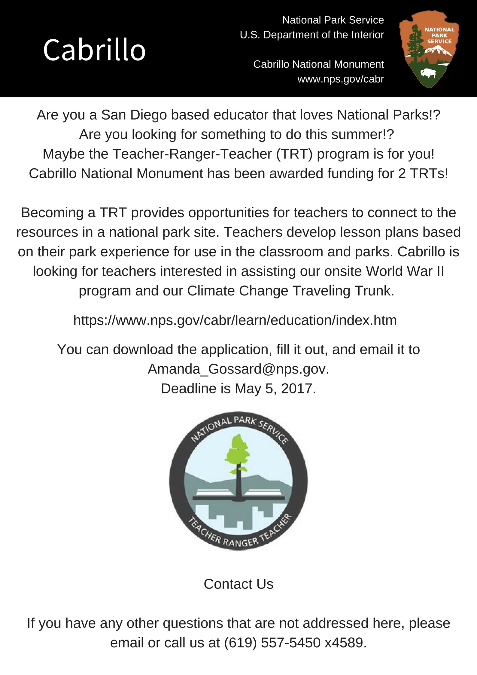 Park AdminApply for Teacher-Ranger-Teacher Positions Share this: Click to share on Facebook (Opens in new window) Facebook Click to share on X (Opens in new window) X Click to email a link to a friend (Opens in new window) Email Click to print (Opens in new window) Print Like Loading... Related