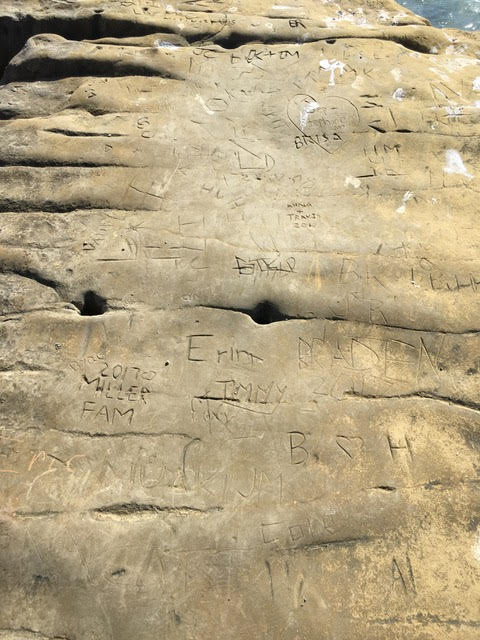 The graffiti carvings in the rocks are illegal and ugly, and they damage the resource. They may also inspire copycat behavior, leading other visitors to make their own carvings in the rocks.