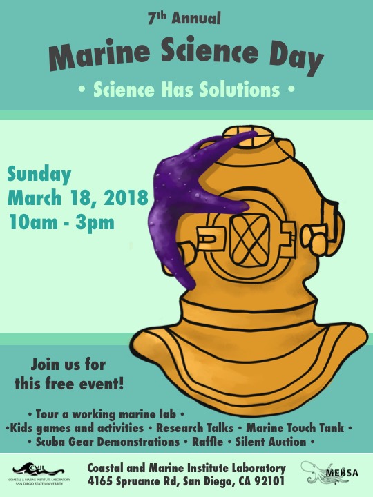 You are invited to the upcoming Marine Science Day at San Diego State University’s (SDSU) Coastal Marine Institute Laboratory. Marine Science Day is a free showcase of SDSU’s marine lab facility and scientific research for the public and SDSU students. Throughout the day there will be interactive family-friendly activities, research talks given by students and faculty, games, a marine life touch tank, SCUBA gear demonstrations, raffles, a food truck, and much more! This event will increase public awareness of the exciting marine research conducted by SDSU faculty and students, and will provide public educational and outreach activities related to marine science and conservation and local marine ecosystems.