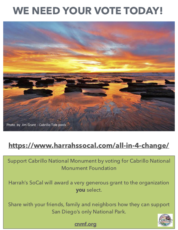 Beginning at 8 AM on Monday, April 9, you will be able to cast your ballot for the Cabrillo National Monument Foundation. All voting is on-line at the Harrah’s site: https://www.harrahssocal.com/all-in-4-change/. You must be 21 or older to vote and may vote only once. Your votes will enable us to pursue our goals of bringing the wonders of the Park and our incredible natural environment to people throughout the county who may be unable to travel or have limited access to the resources of the Park. We are actively developing an Mobile Educational Outreach Program to achieve these goals.