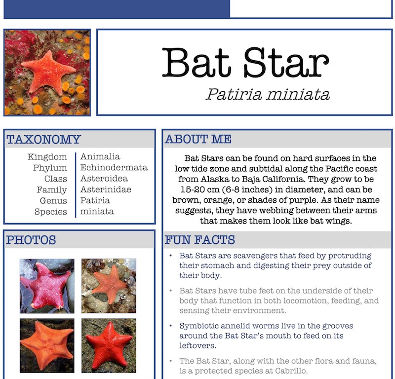 TPERPCreature Feature – Bat Star This month’s Creature Feature at the Tidepools Educations Table is the Bat Star. Share this: Click to share on Facebook (Opens in new window) Facebook Click to share on X (Opens in new window) X Click to email a link to a friend (Opens in new window) Email Click to print (Opens in new window) Print Like Loading... Related