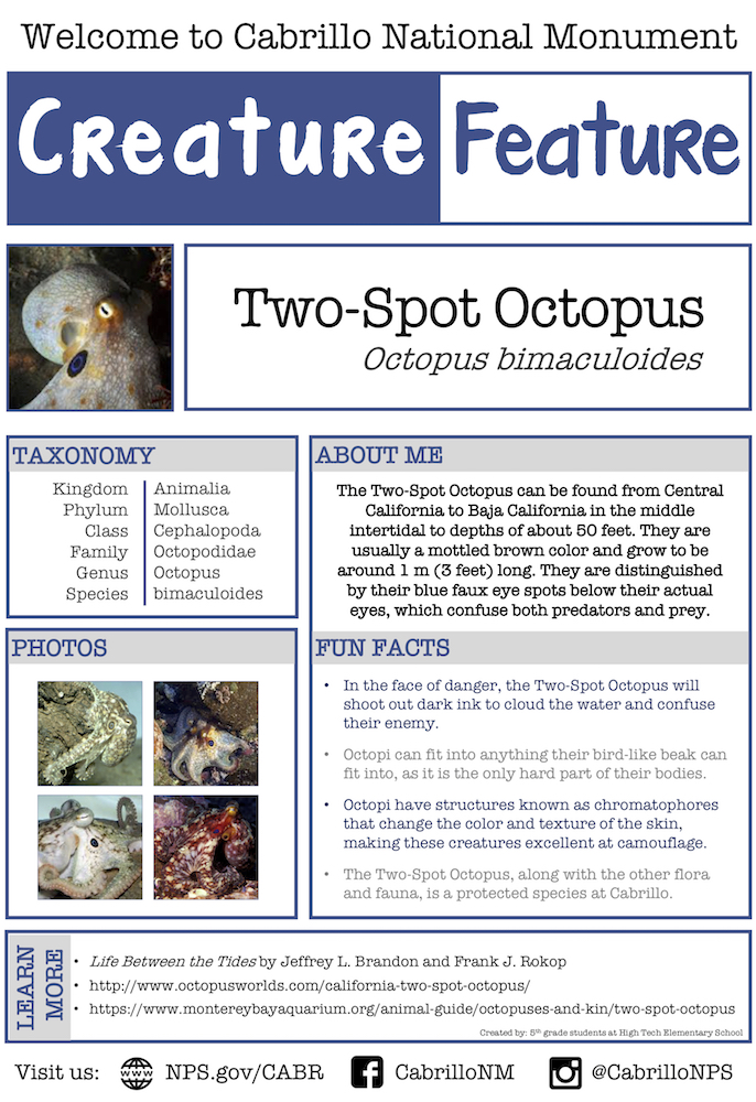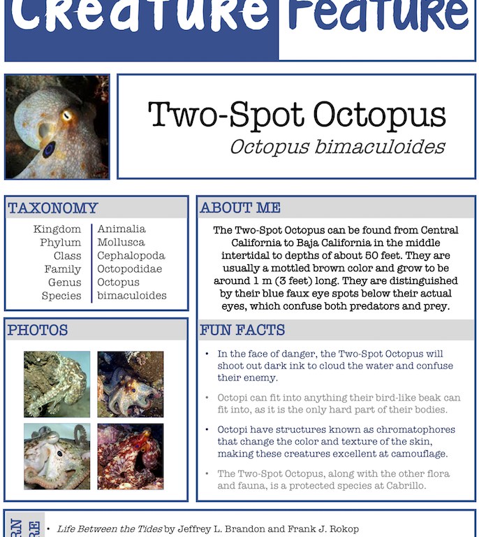 TPERPCreature Feature – Two-Spot Octopus This month’s Creature Feature at the Education Table is the Two-Spot Octopus. Share this: Click to share on Facebook (Opens in new window) Facebook Click to share on X (Opens in new window) X Click to email a link to a friend (Opens in new window) Email Click to print (Opens in new window) Print Like Loading... Related