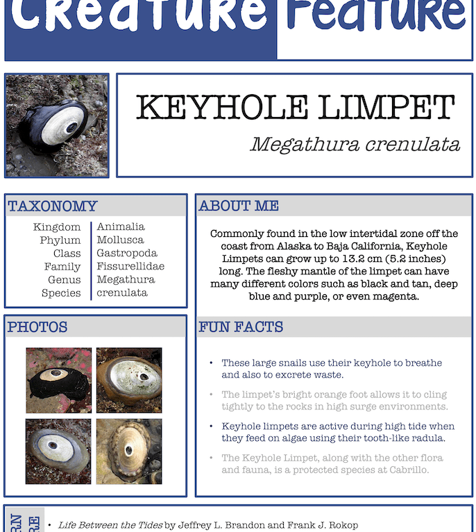 TPERPCreature Feature – Keyhole Limpet This month’s Creature Feature at the Tidepool Education table is the Keyhole Limpet. You can learn more about it here. Share this: Click to share on Facebook (Opens in new window) Facebook Click to share on X (Opens in new window) X Click to email a link to a friend (Opens in new window) Email Click to print (Opens in new window) Print Like Loading... Related