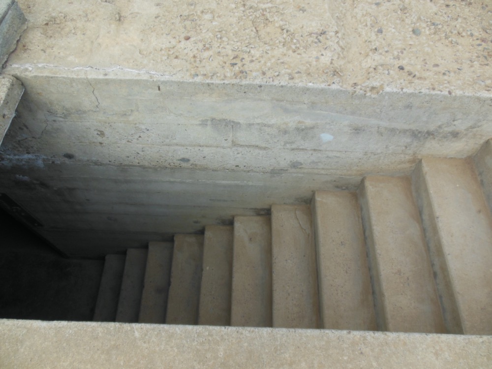 As in all concrete construction, the bunker’s concrete is strengthened by using steel bars. The problem is that when this water reaches the steel, the metal rusts. This rust takes up a lot more volume than the steel, so the rust pushes on the concrete until it splits. This is called “spalling” and can eventually cause large areas of the concrete to break off. Spalling isn’t very photogenic, so this is the best picture I have of it, look at the left side of the photo.
