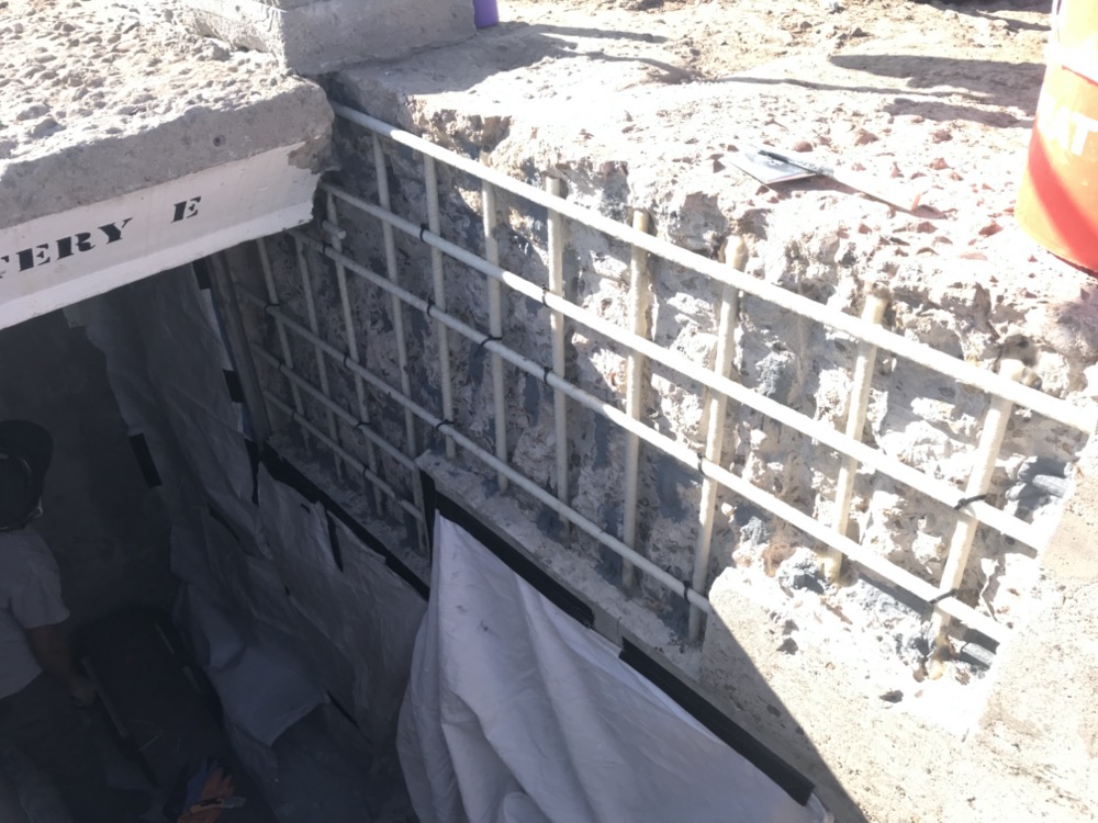 During the week of November 4, 2019, the NPS restoration crew removed roughly 10 square feet of spall, and cut away all the rusted rebar underneath. Removing the damaged concrete is the only way to repair it; once it’s split, there is no way to reattach it. A week later the crew replaced the iron rebar with fiberglass rods. Modern fiberglass is strong enough to be a stand-in for iron, and these new rods will never rust.
