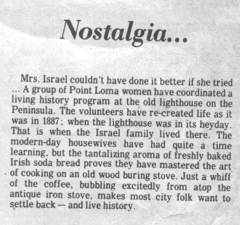 Barbara Jones, who lived in Point Loma, also participated in the lighthouse volunteer effort. In fact she was the coordinator for the volunteer program at Cabrillo, and was responsible for starting the Living History program at the park. As you will read below, the people who volunteered in the lighthouse were all members of the Point Loma Garden Club, including Barbara Jones, Martha Kievit, and Dora Wieder. They also started the Kitchen Garden due to their interest in gardening.