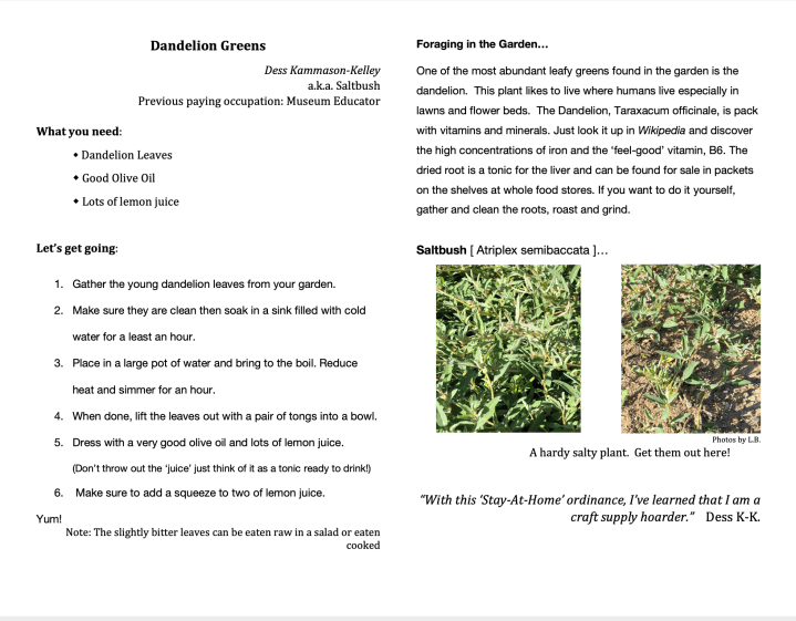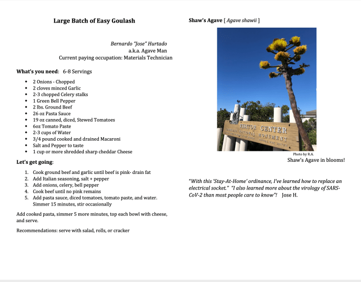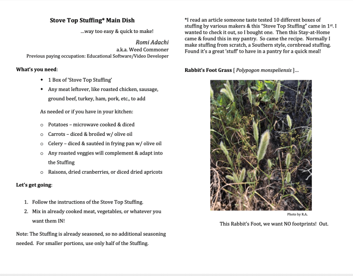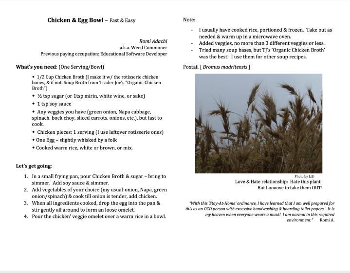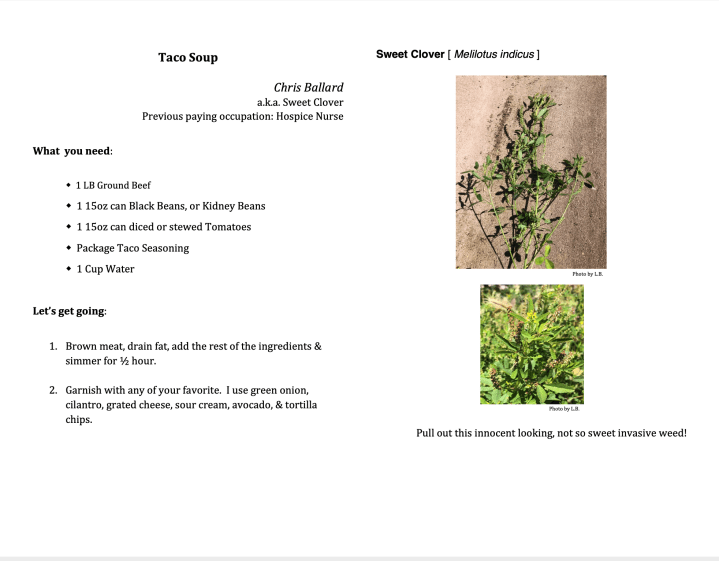 The Weed Warriors submitted recipes with the idea being that we had to use ingredients that we had in our own homes, since we couldn’t go to the store. Each submission has the name of the Weed Warrior, their nickname, a picture of a Weed Warrior specific plant species, and the individual’s thoughts on the “Stay-at-home” situation. This cookbook is useful at home, entertaining, and a learning tool for park invasive plants.