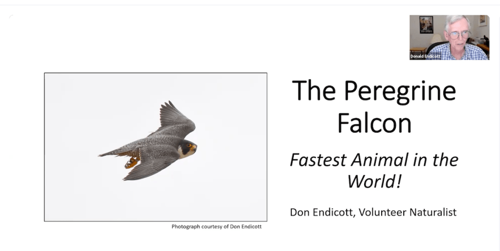 Last Friday VIP Don Endicott presented a talk about the Peregrine Falcon. If you missed it or want to watch it again, here is the link.