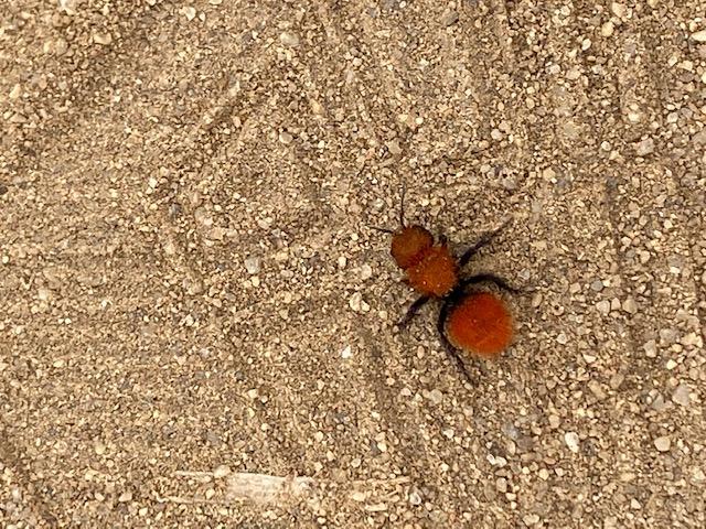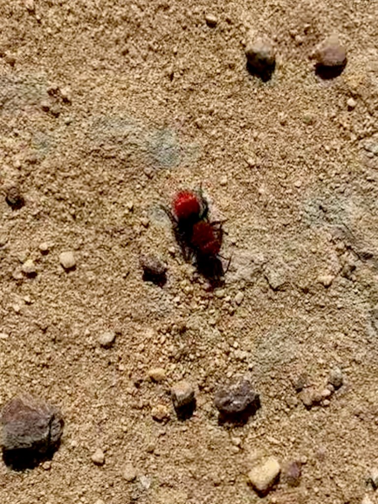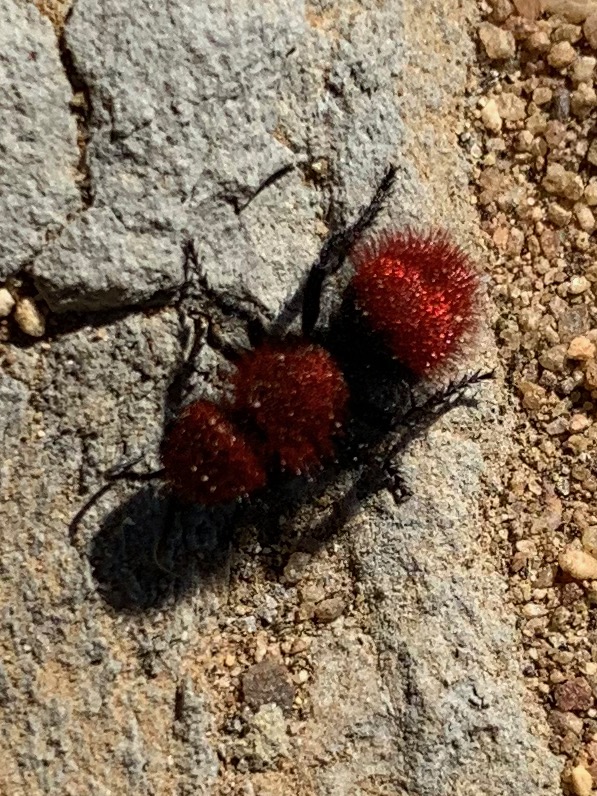 Here’s another photo of it. This one was taken along the Tidepool Spur trail back in November. We didn’t know what it was then either. It was uploaded to iNaturalist where we learned what a velvet ant was. It is of the genus Dasymutilla or Nocturnal Velvet Ants.