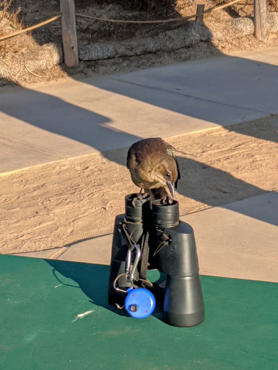 Also this weekend, our friend Gracie was still hanging around the Coastal area and the tidepools. We told you about Gracie the Grackle last week. On Friday, she was very interested in a set of binoculars on the Education Table.