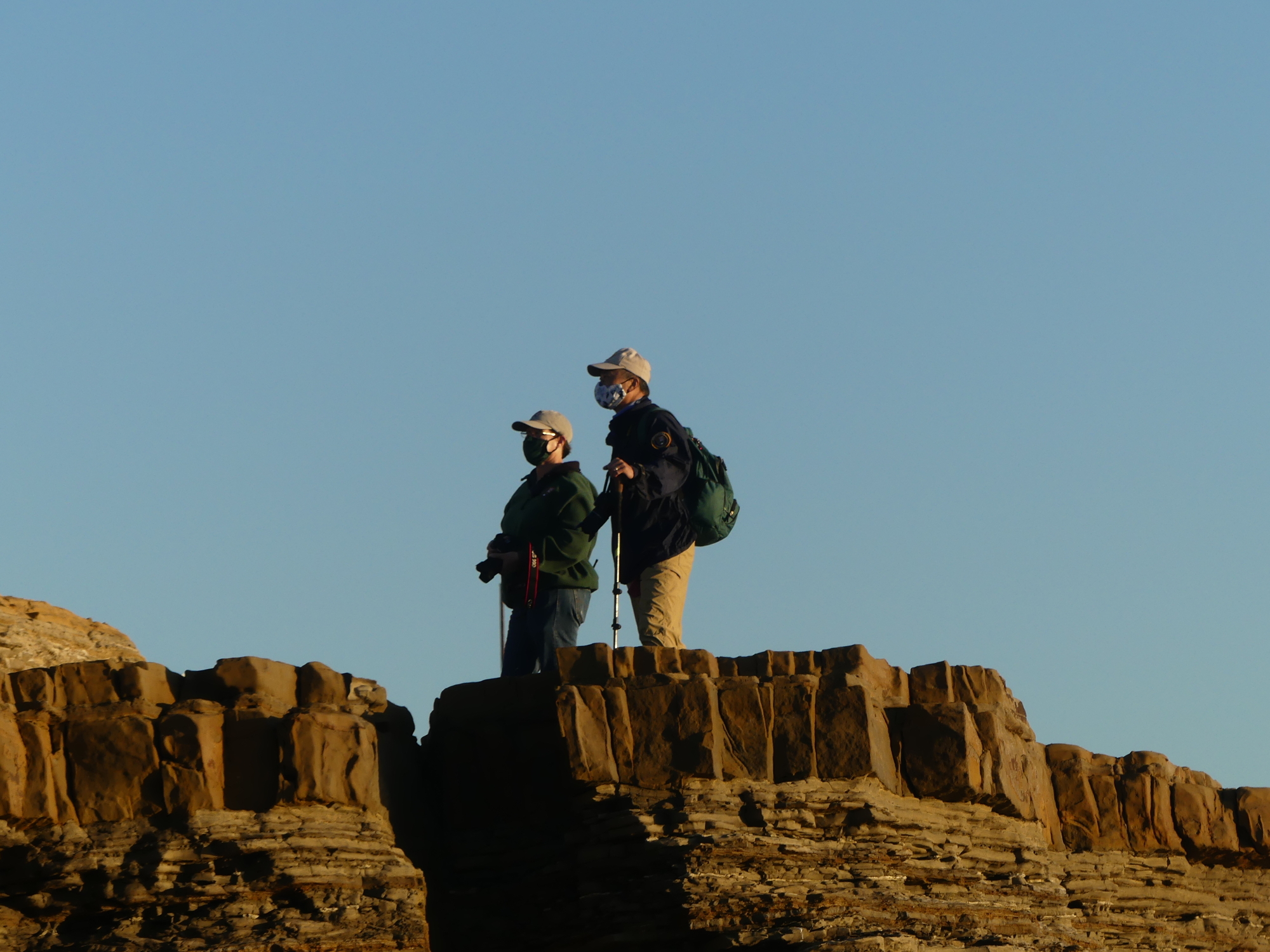 Volunteers in baseball caps and jackets stand on sandstone cliffs.
