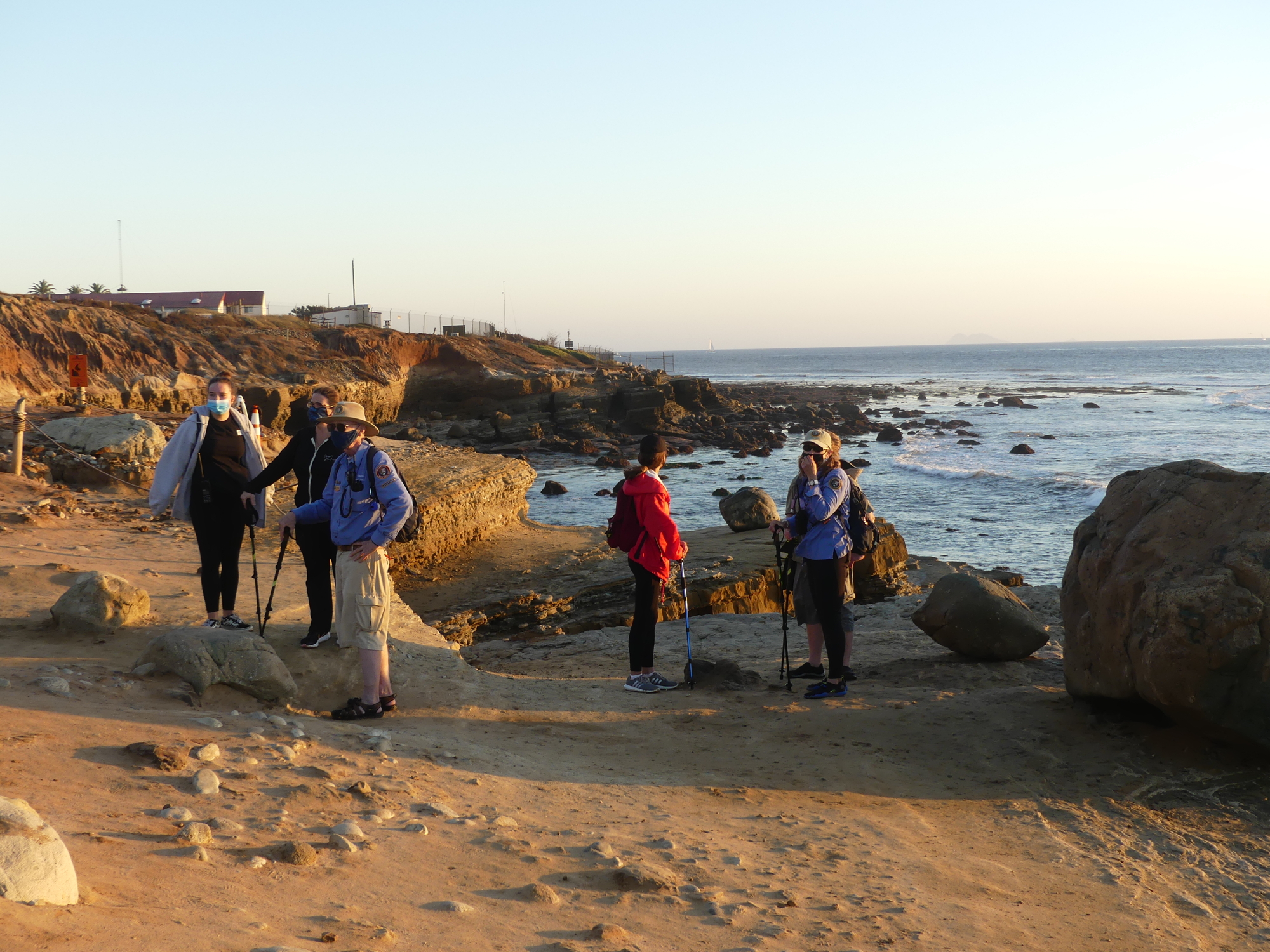 People stand on sandstone cliffs overlooking the ocean. Volunteers are wearing long sleeve blue shirts.