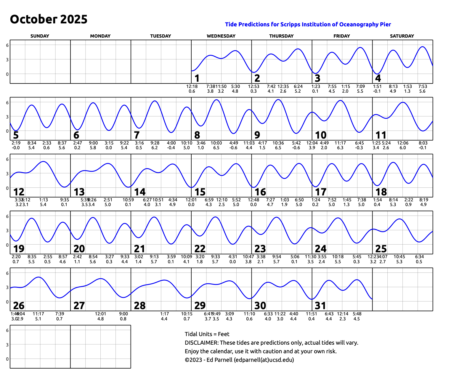 At Cabrillo, a 0.7 tide or lower will give you the best ability to explore the actual tidepools. There are two high tides and two low tides each day. Use these tables to find the times of the high and low tides.