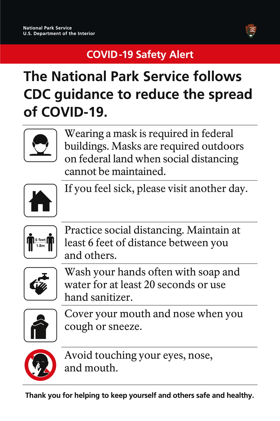 The NPS expects everyone who works in or visits national parks to wear a face mask outside on NPS-managed lands where physical distancing cannot be maintained and in all federal buildings. Park rangers are on duty to uphold normal rules and regulations as well as this requirement and may issue citations as appropriate for anyone in violation.