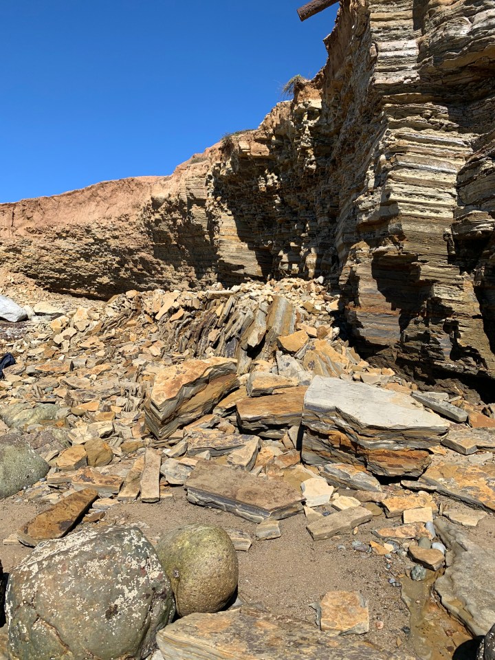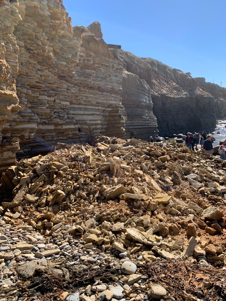Broken sandstone rocks against a layered cliff. Several people are in the background looking at the rock fragments.