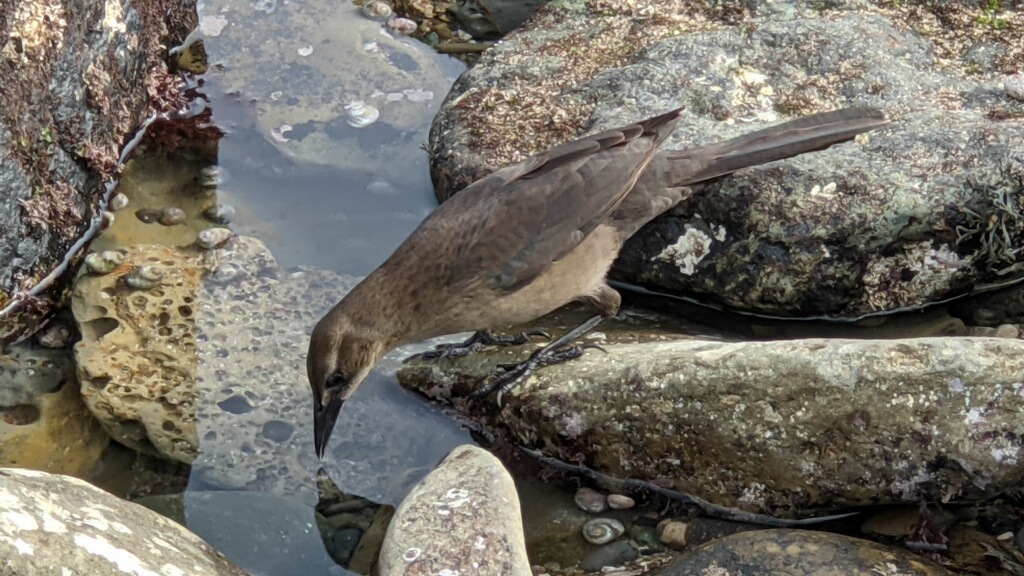 Gracie the Grackle is frequently seen in the tidepool area. Grackles are relatively uncommon at Cabrillo National Monument and San Diego in general.