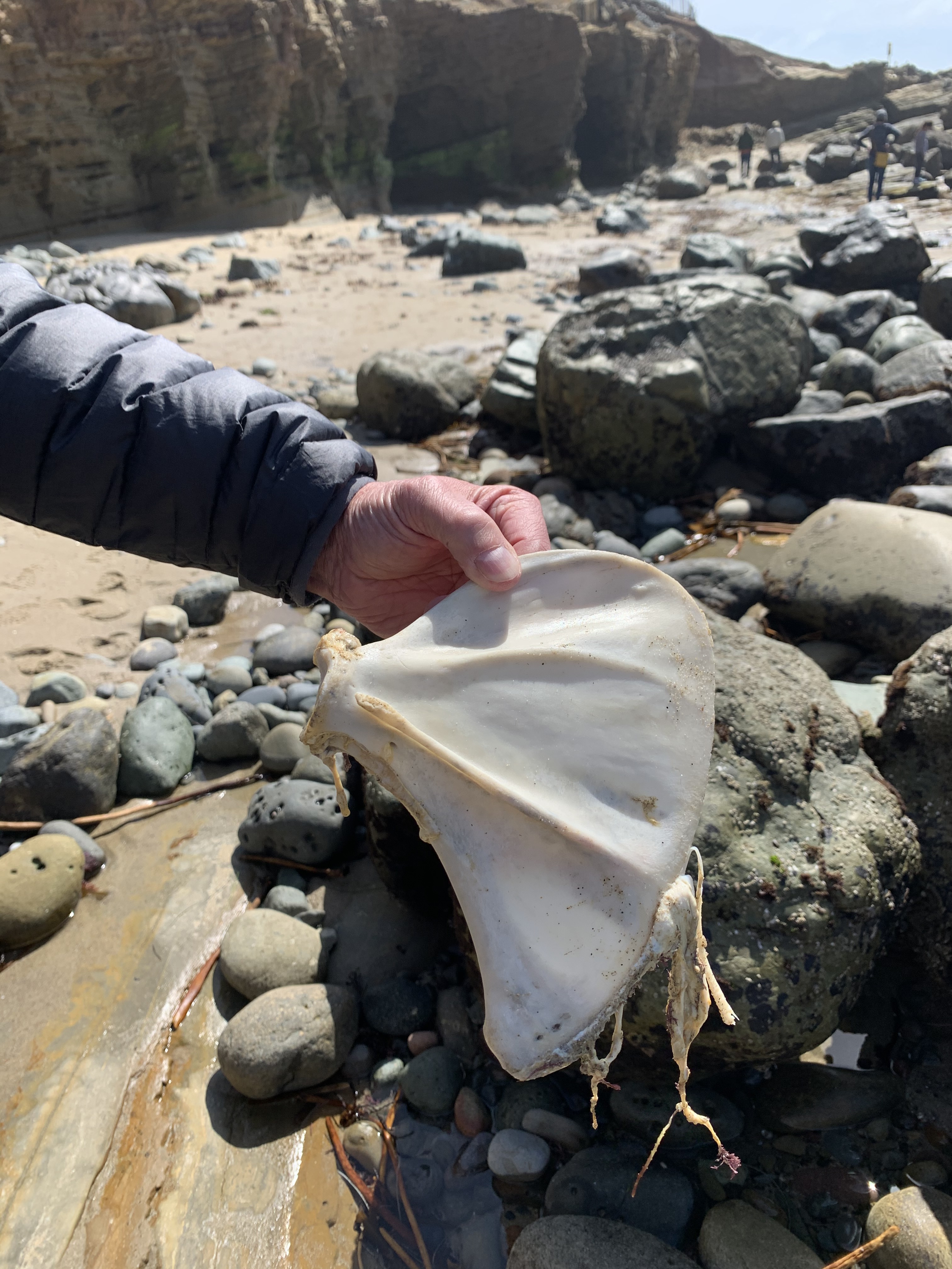 This Swell Shark egg sack, also known as a Mermaid’s Purse, is found quite frequently in the tidepools. The hook at the top is used to attach to kelp. Once the shark hatches, this egg sack washes up into the tidepools.