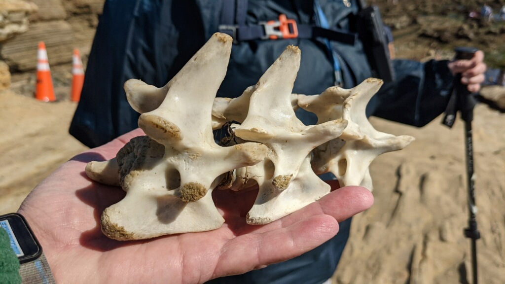 The bone of a seal is held by a person along a rocky beach next to sandstone cliffs