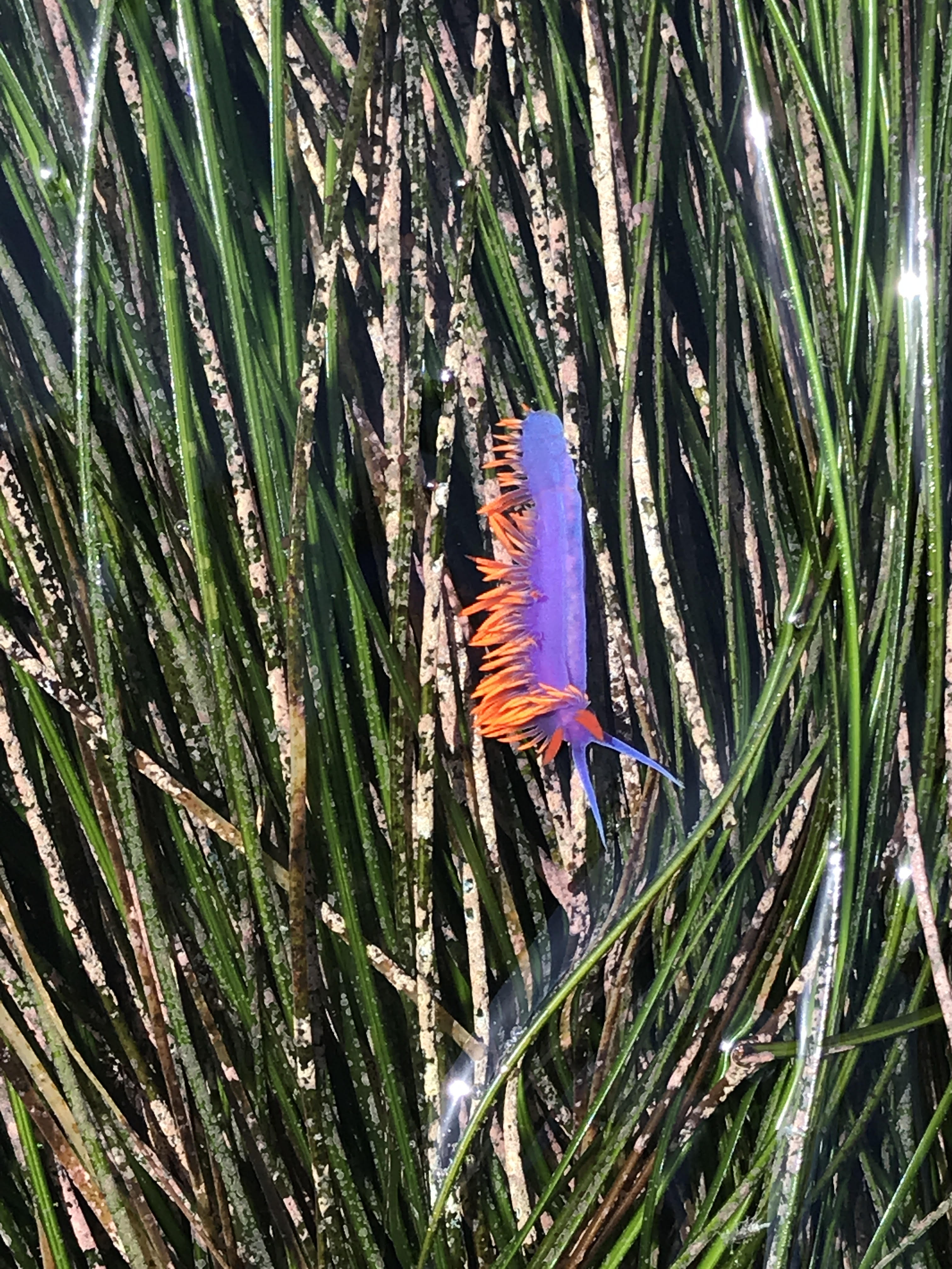 Spanish Shawls belong to the nudibranch family. As you can see here, they are spectacularly colored with a blue-purple body and bright orange appendages called cerata. They move by flexing their body in a signature “S” shape.