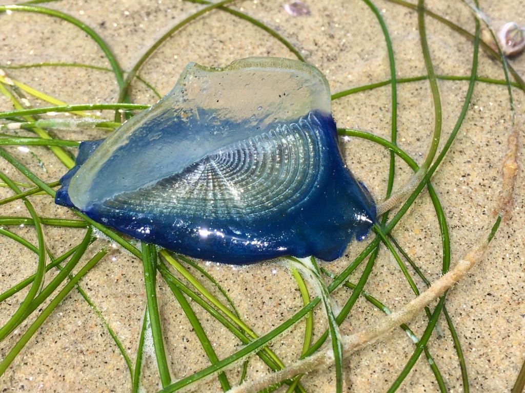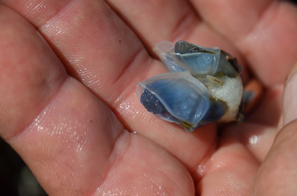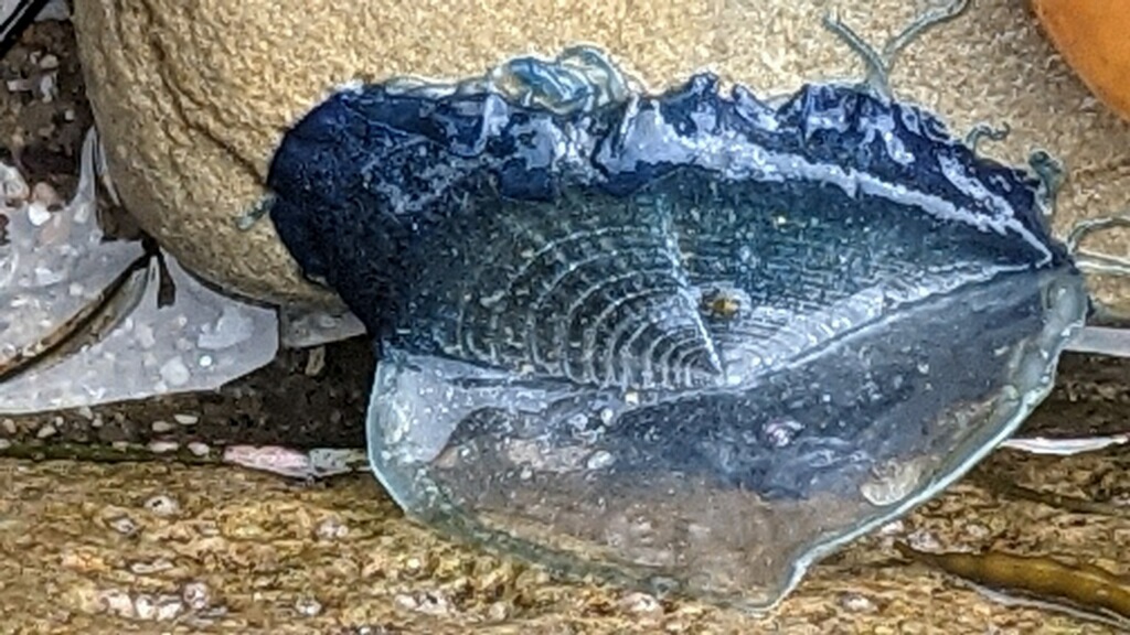 This is a By-the-Wind-Sailor, a species of jellyfish. Like the name suggests, they are propelled by a small sail raised above water, moving wherever the wind takes them. These jellyfish occasionally wash up on beaches in large numbers, especially in the spring after a warmer-than-average winter. Recently, visitors and TPERPers alike have been finding these jellyfish, most of them dead by the time they arrive in the tidepools.