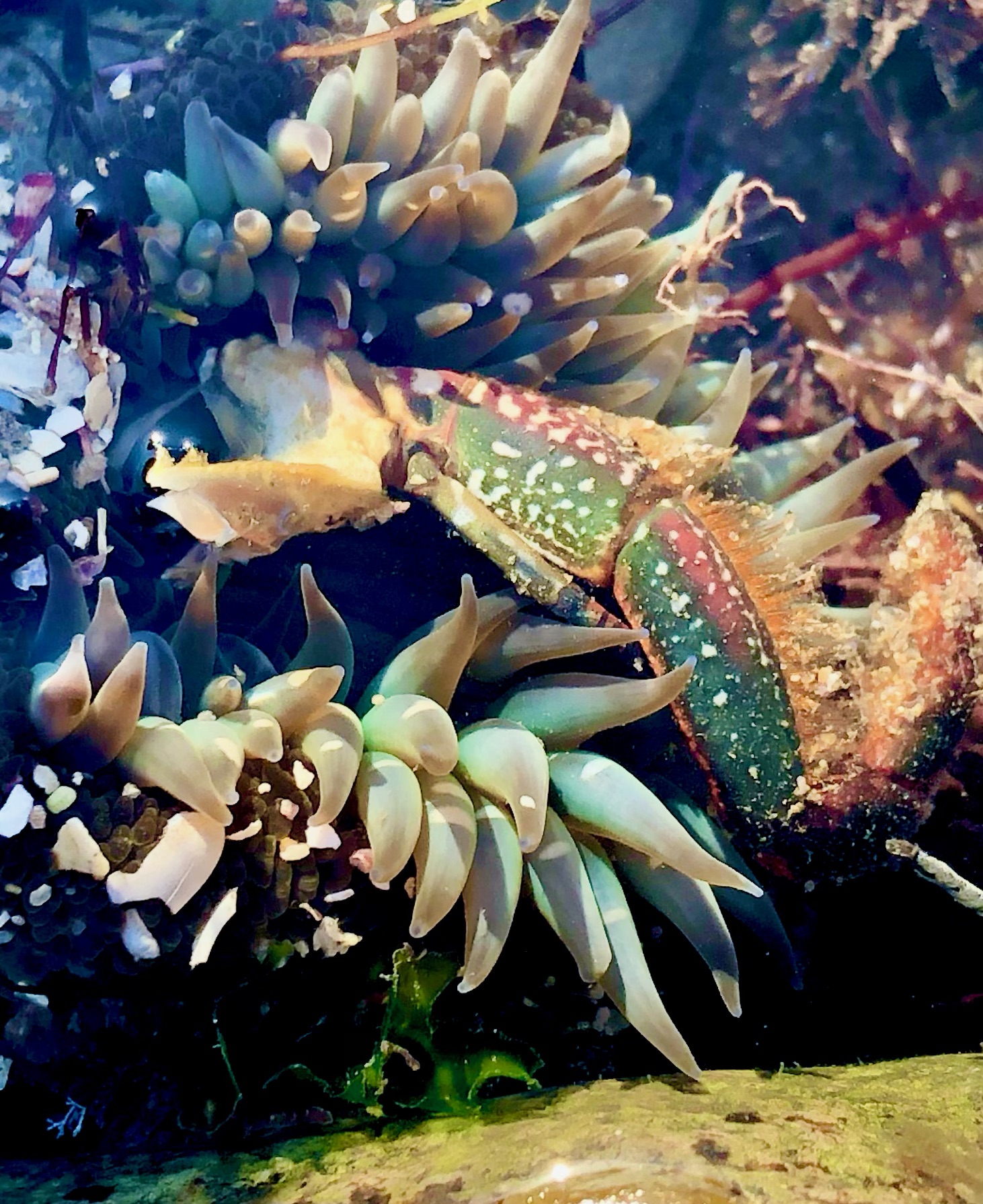 It’s rare for visitors and TPERPers alike to see California Spiny Lobsters up close, other than when their molts wash up on shore. In this photo, it’s easy to see why female lobsters are considered fierce predators in the rocky intertidal zone with claws and hooks on the last pair of legs. They are typically called pincers. The pincers aid in depositing and tending to her eggs which are kept on the underside of her tail.