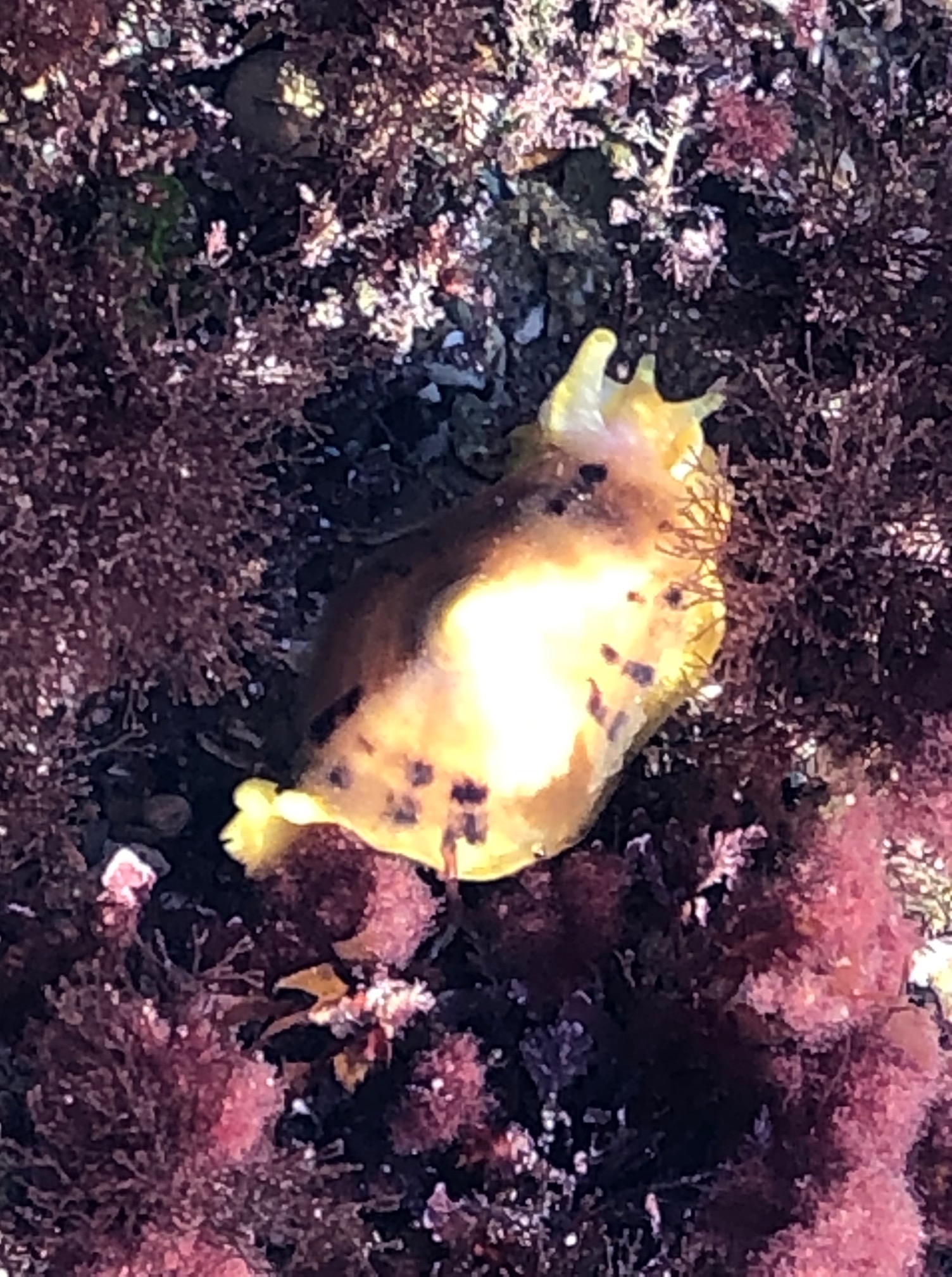 This is a Yellow Umbrella Slug, part of the Nudibranch family. It was discovered in Zone 1 by a visitor. Hundreds of varieties of nudibranchs exist, and it is always fun to see an uncommon one in the tidepools.