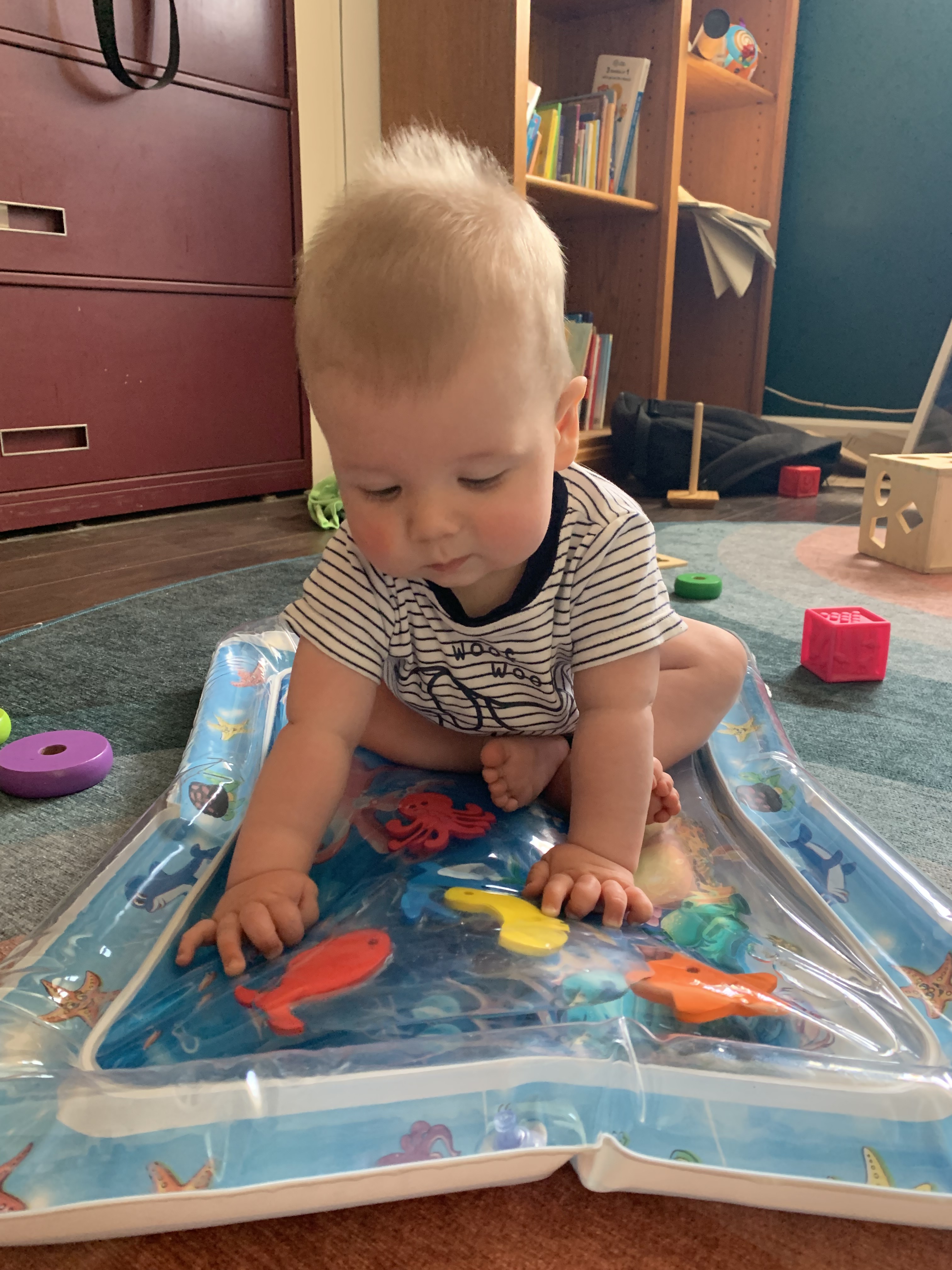 Julian is already 8 months old! He loves going for stroller walks and looking at trees, and playing with his water mat to practice his tidepool observation skills. He is starting to crawl and is finally starting to like eating solid food. So far his favorite foods are bananas, peanut butter toast, and puréed beets! “