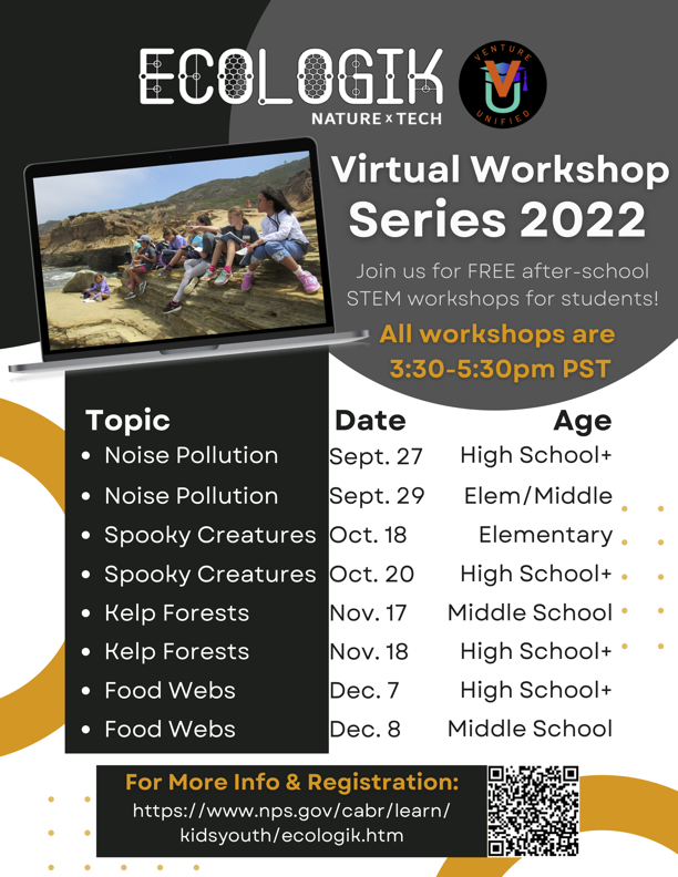 Sonya Timko, who just presented at the TPERP Conference on Thermal Ecology of Crabs, wanted to invite all volunteers to the virtual workshops that she is holding for EcoLogik! They are also free to include children / grandchildren as well! They are on some great topics that the volunteers will hopefully not only find interesting, but can share with the visitors to the parks. She has included information on Cabrillo and how the following topics tie into Cabrillo as well! She has attached flyers for the available workshops coming up soon.