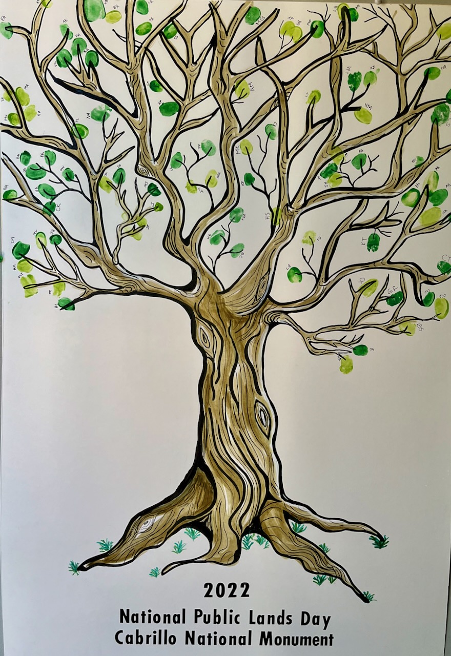 Last Saturday was National Public Lands Day and Cabrillo hosted an activity table for Junior Rangers. We want to give a special shoutout to VIP Mary for using her art skills to help out. She painted a tree for Cabrillo that allowed Junior Rangers and their families to fingerpaint their “promise leaves” onto it. Thank you, Mary! It was a busy day due to also being Junior Scientists Day as part of Ecologik, but also a Fee Free Day.