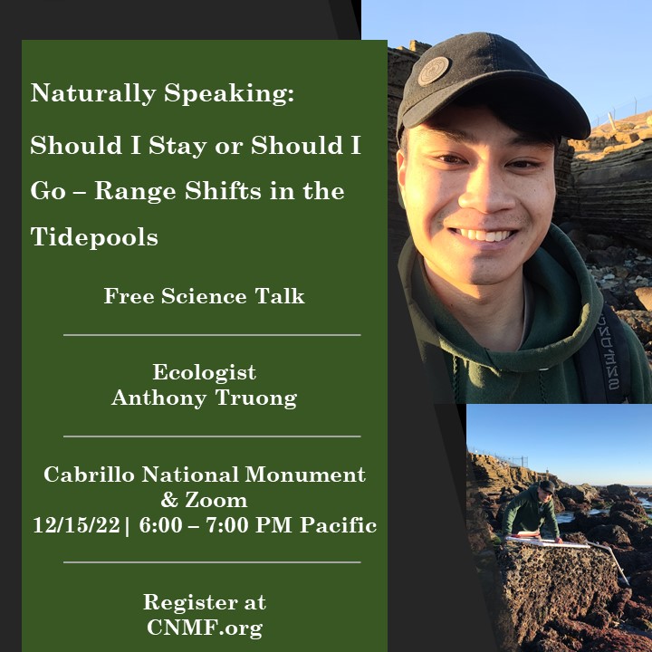 Many species are shifting their ranges as a response to climate change. The dark unicorn whelk (Mexicanthina lugubris) is native to the tidepool communities of Baja California, Mexico, but their range has shifted northward over 60 miles into Southern California since the 1980s. While dark unicorn whelk shells have been found in San Diego County dating back to the 1930s and 1950s, it is unknown whether their abundance is increasing, decreasing, or stable over time. Join ecologist Anthony Truong as he discusses his research on unicorn whelks at Cabrillo National Monument and how man-made stressors like climate change affect ecological communities as a whole.