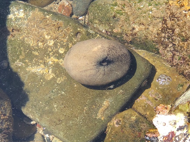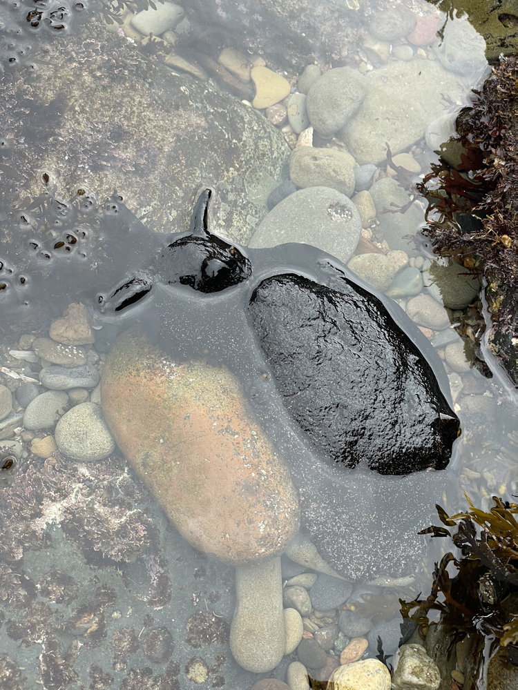 Sea Hares have been found in all areas of the tidepools, some as small as 3 inches. These photos show a Black Sea Hare. One photo shows it in the water where you can see its “rabbit ears”. The other photo shows what a sea hare looks like when it is out of the water. They can often look like a shiny blob or rock. They are just waiting patiently for the tide to roll back in.