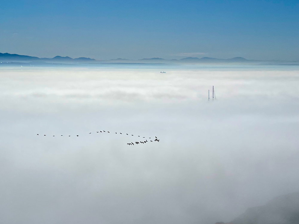 Ghost Ship – On March 19 we had a thick low fog layer covering the bay and most of San Diego. Cabrillo was above the fog giving this shot of the masts of a sailboat sailing out of the bay along with a squadron of pelicans flying by.