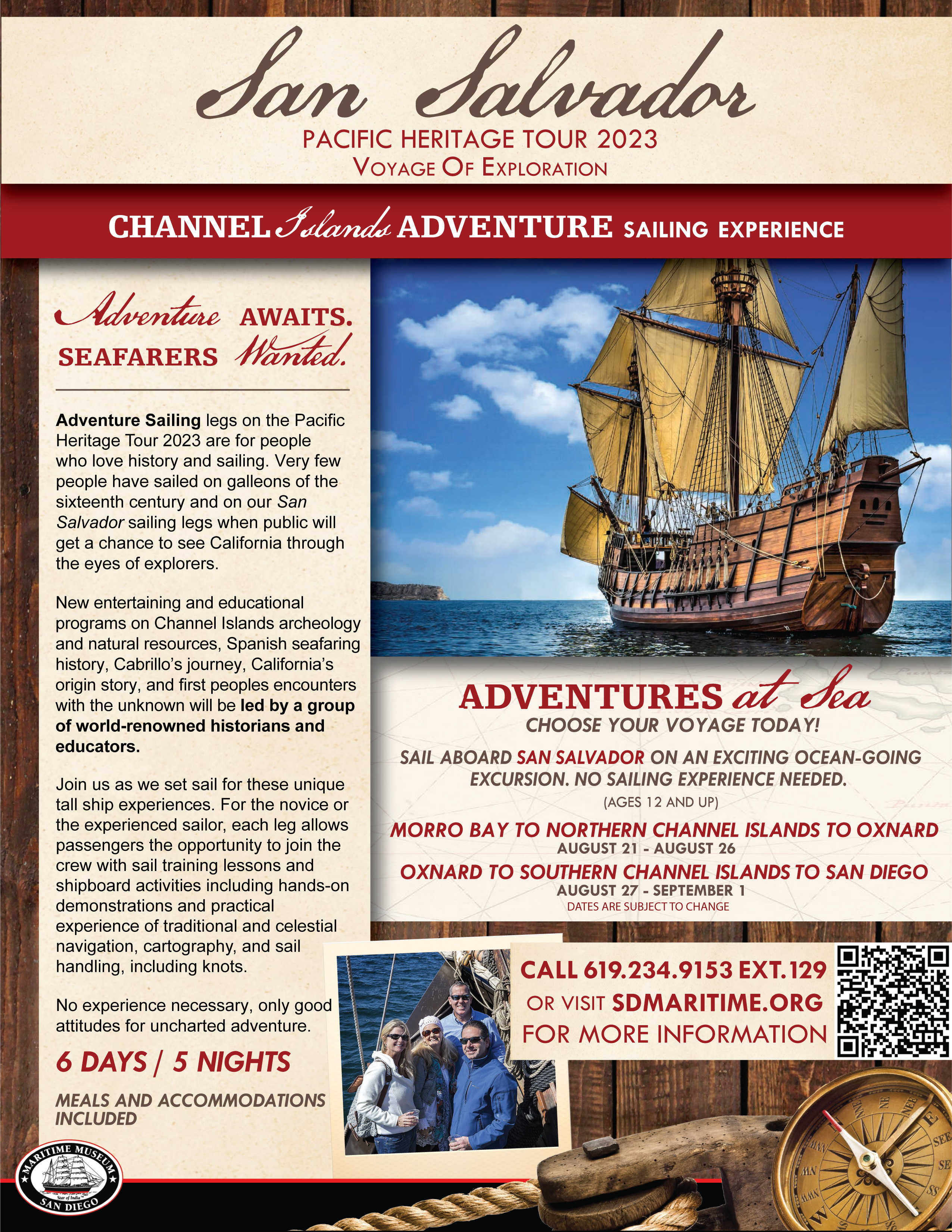Here is your opportunity to sail on the San Salvador as it goes on its 2023 Pacific Heritage Tour. Contact the San Diego Maritime Museum for more information.