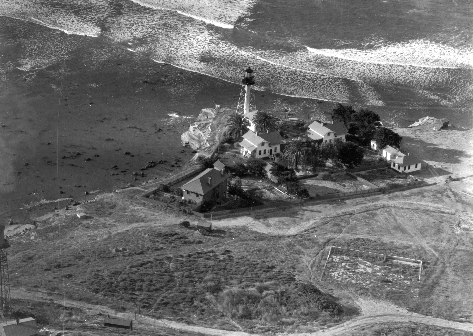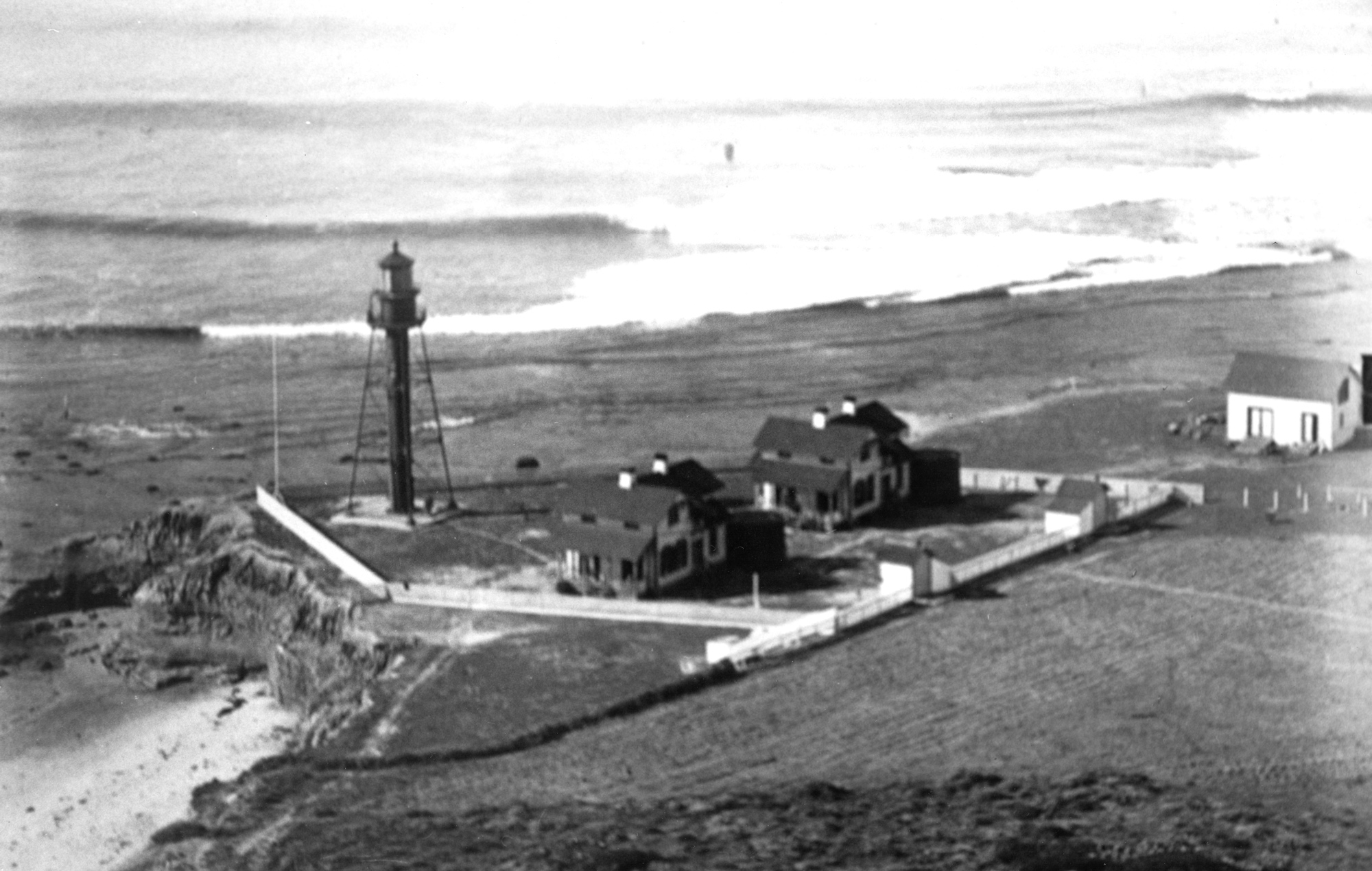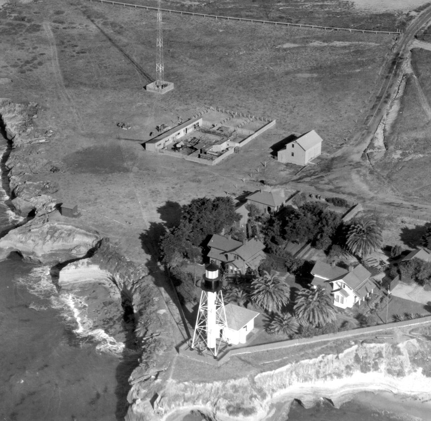 A last remnant of World War II camouflage paint still covers the west dwelling and a few outbuildings of Point Loma Light Station. Note the extensive farming enclosure where horses Rosita and Sonny graze. Light keepers supplemented low Federal paychecks with food from animals, garden vegetables, and fruit trees.