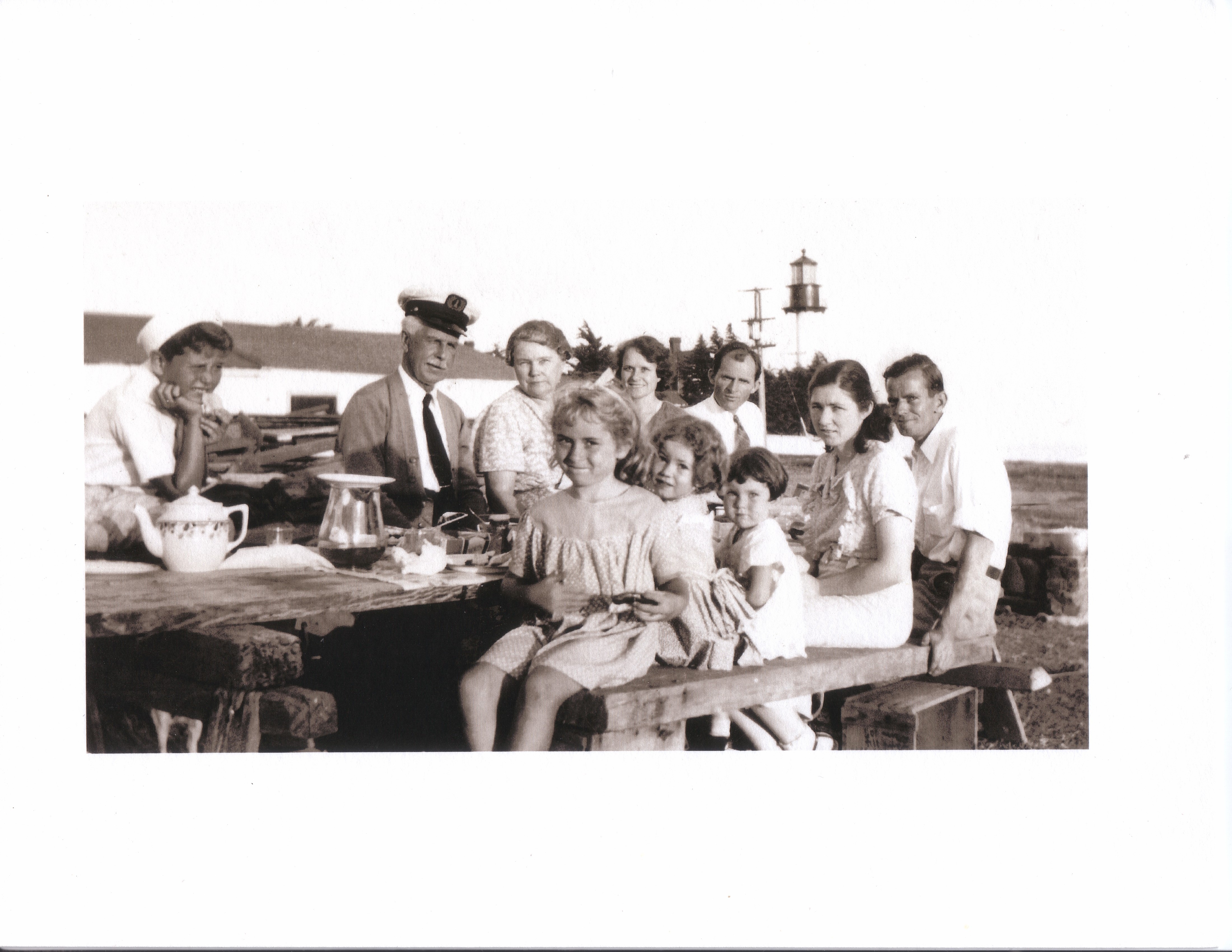 Three Point Loma Lighthouse keepers and their families set aside lighthouse duties and dress up for lunch out. Note the light tower above. In his regulation cap, head keeper George Cobb sits with his wife, Theodora, and Louise and Milford Johnson. On the rough n’ ready bench are Lexie Johnson (front left) and Patty, Joan, Violet, and James Dudley. Lexie’s cousin Franklin sits near a china teapot–no plastic utensils at this picnic!