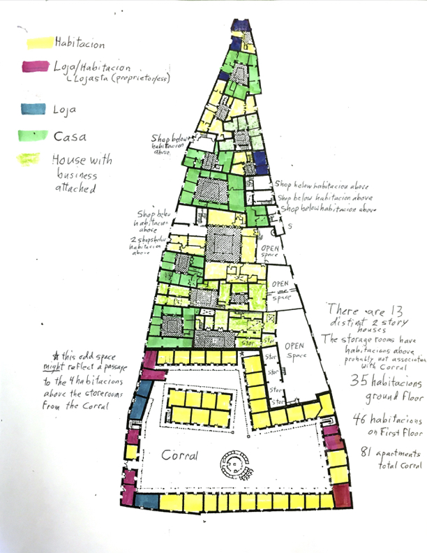 The owner of the corral invariably would not live in or near it. His agent, the Mayordomo, probably occupied one of the more modest of the 13 courtyard houses in the block. The courtyard houses on this block might be the homes of professional ship officers such as the Sailing Master or Despensero.